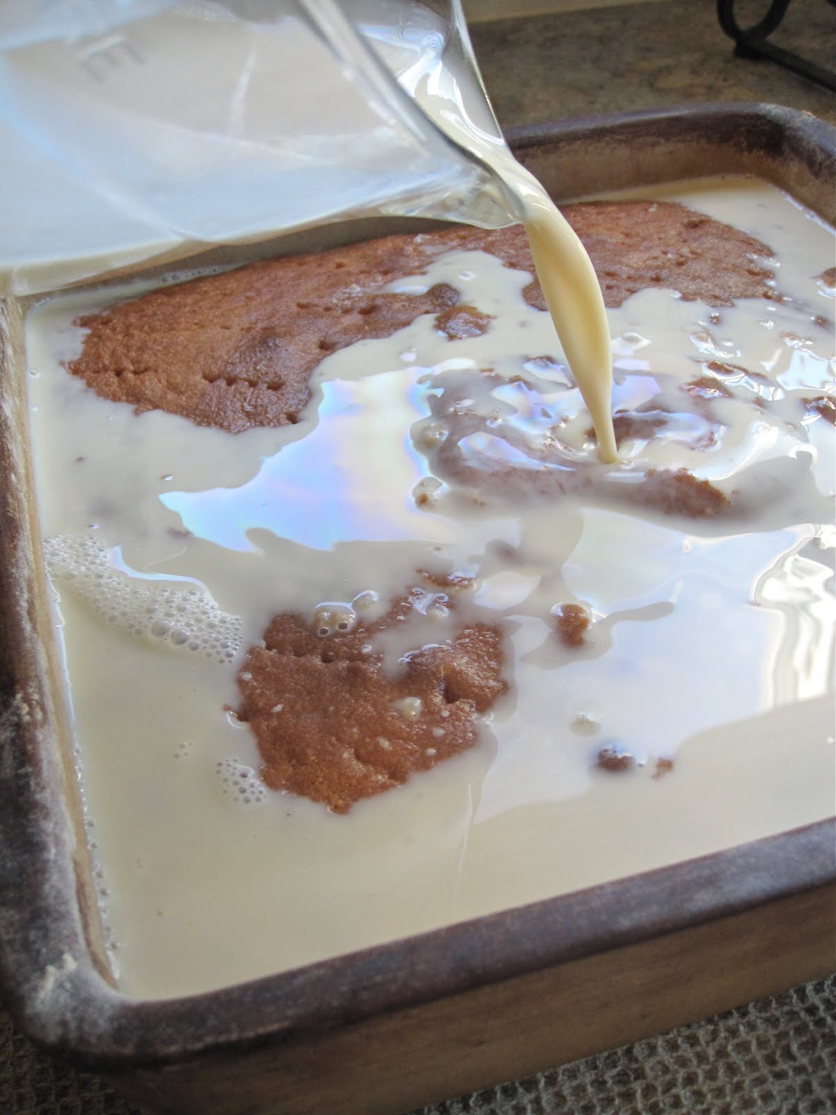 After the vanilla cake has been baked, poke it multiple times with a fork (as shown below). In a small sauce pan combine the evaporated milk and the sweetened condensed milk and heat on medium low until warm. Pour the milk mixture on the cake, dispersing it evenly. Top the cake with fresh strawberries and refrigerate.